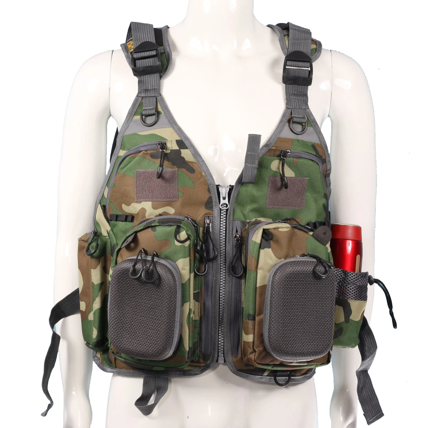 four generous chest pockets, four front pockets with zipper, two side Nietzsche, and a generous pocket as a whole.