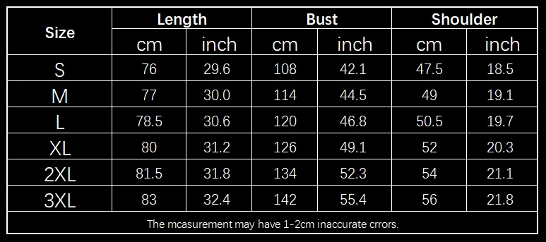 | Size(cm) | Bust | Shoulder | Length |